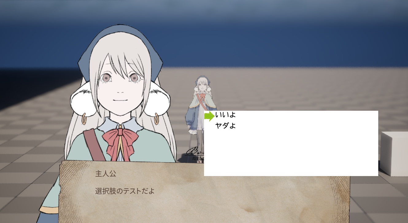 現在、会話と選択肢のシステムを作っているところです。